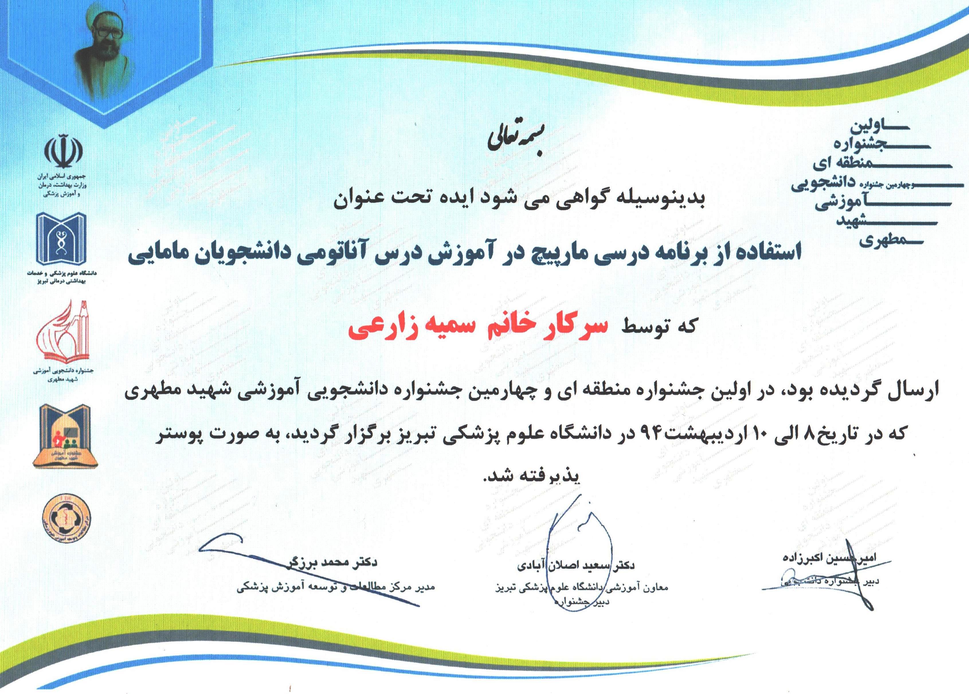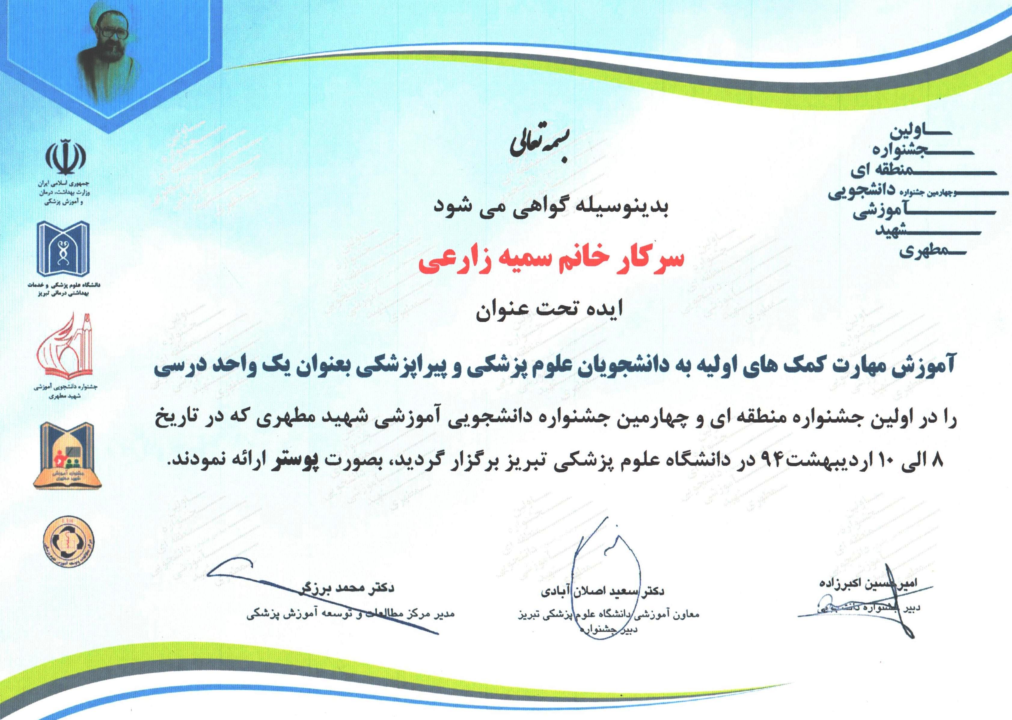 بدینوسیله افتخار آفرینی سرکار خانم سمیه زارعی، دانشجوی دانشکده پرستاری و مامایی تبریز در اولین جشنواره منطقه ای و چهارمین جشنواره دانشجویی آموزشی شهید مطهری را ...