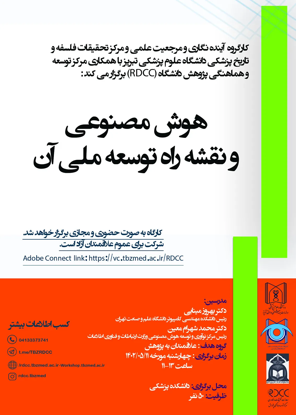 کارگروه مرجعیت علمی و آینده نگاری و مرکز تحقیقات فلسفه و تاریخ پزشکی دانشگاه علوم پزشکی تبریز با همکاری مرکز توسعه و هماهنگی پژوهش دانشگاه (RDCC) وبینار «هوش مصنوعی و نقشه راه توسعه ملی آن» را از ساعت 13-11 روز چهارشنبه مورخه 1402/05/11 با امکان شرکت علاقمندان بصورت حضوری و مجازی برگزار خواهد کرد.
