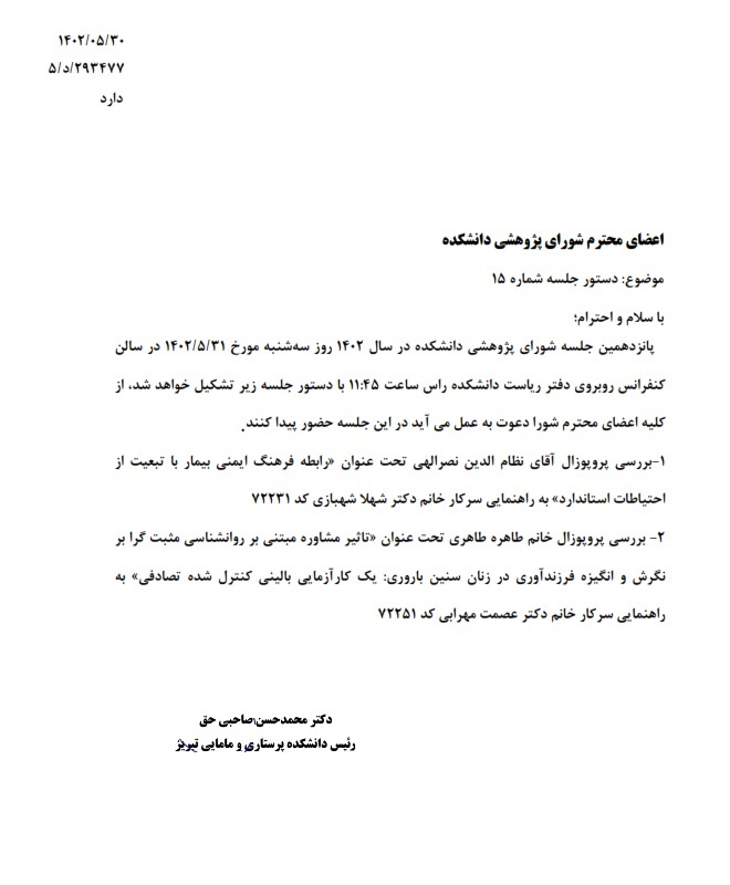 پانزدهمین جلسه شورای پژوهشی دانشکده در سال 1402 روز سه شنبه مورخ 1402/05/31 در سالن کنفرانس روبروی دفتر ریاست دانشکده راس ساعت 11:45 با رعایت کامل پروتکل های بهداشتی (رعایت فاصله بین فردی و استفاده از ماسک و مایع ضدعفونی کننده دست) تشکیل خواهد گردید.
