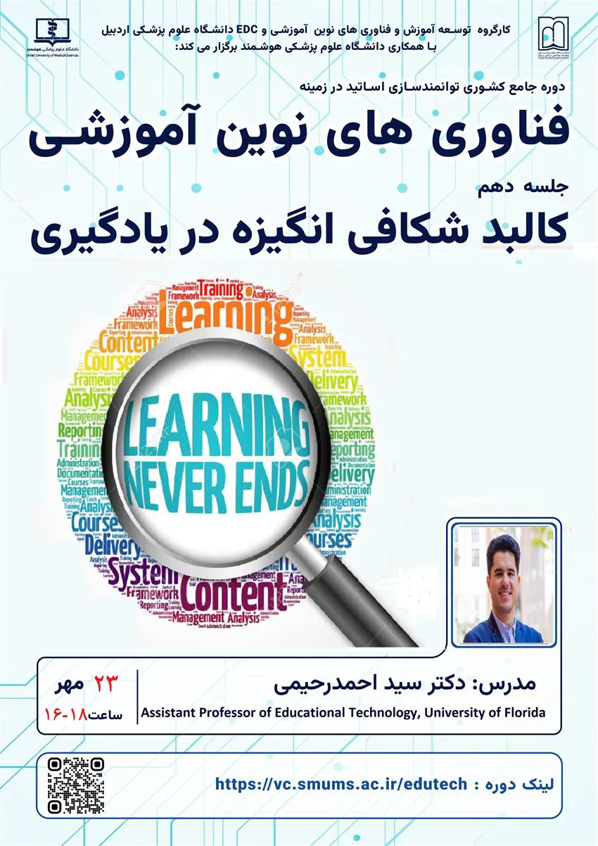 به اطلاع علاقمندان میرساند وبینار کالبد شکافی انگیزه در یادگیری، به همت کارگروه توسعه آموزش و فناوریهای نوین آموزشی و EDC دانشگاه علوم پزشکی اردبیل، روز یکشنبه 23 مهر 1402 از ساعت 16 الی 18 با تدریس آقای دکتر سید احمد رحیمی برگزار خواهد گردید.