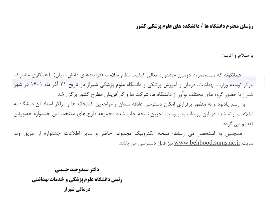 بنا بر اعلام رئیس دانشگاه علوم پزشکی شیراز، آخرین نسخه چاپ شده مجموعه طرح های منتخب دومین جشنواره تعالی کیفیت نظام سلامت (فرآیندهای دانش بنیان) در آدرس اینترنتی این جشنواره قابل دسترسی است.