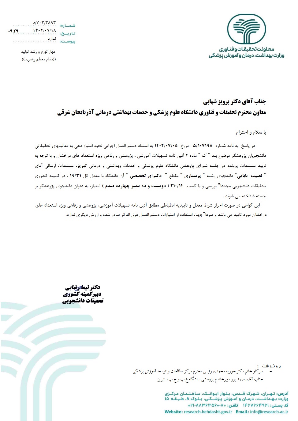 کسب عنوان پژوهشگر برجسته کشوری مطابق بند ک کمیته کشوری تحقیقات دانشجویی، توسط آقای نصیب بابایی