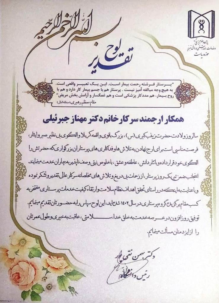 تجلیل از سرکار خانم دکتر مهناز جبرئیلی در آئین بزرگداشت مقام پرستار
