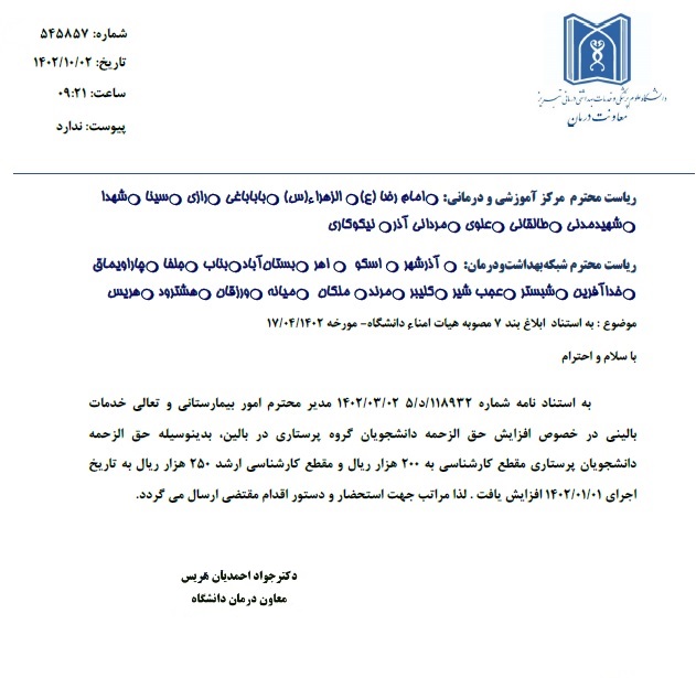 اعلام میزان افزایش حق الزحمه دانشجویان گروه پرستاری در بالین
