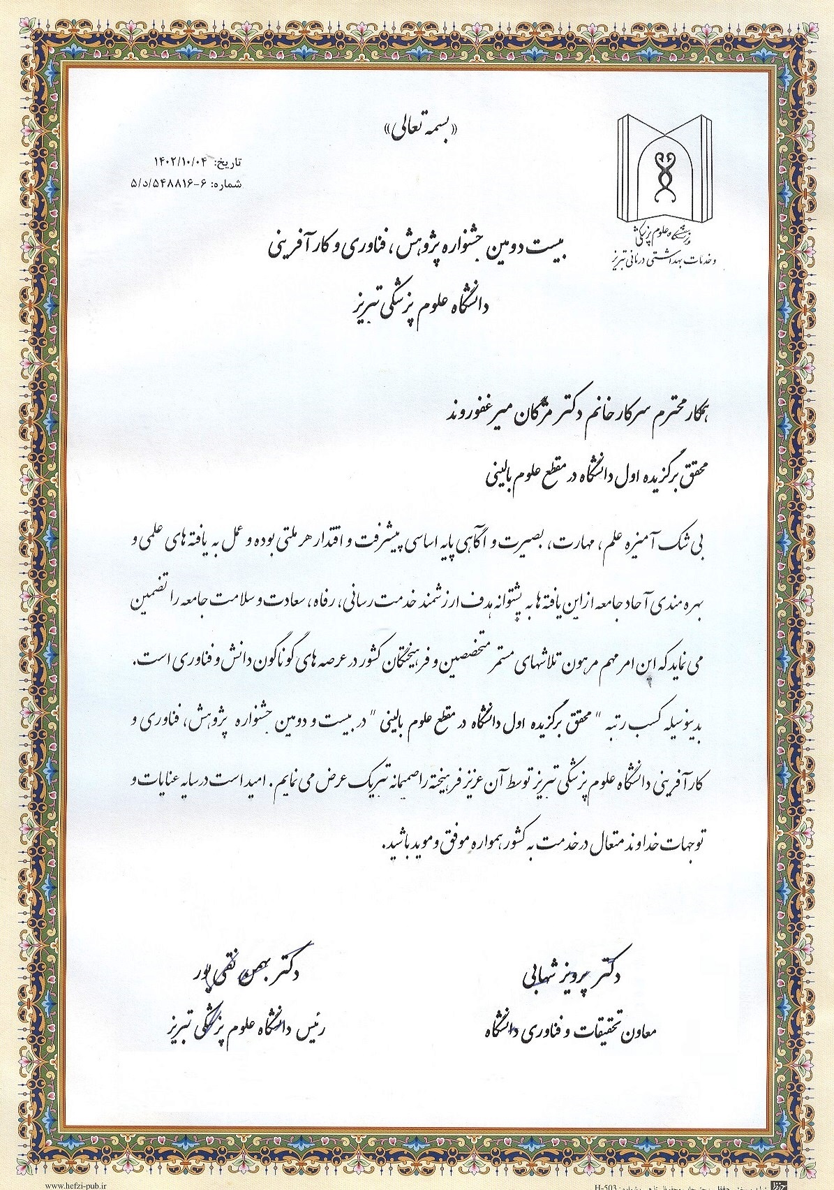 انتخاب خانم دکتر میرغفوروند بعنوان محقق برگزیده اوّل دانشگاه در مقطع علوم بالینی