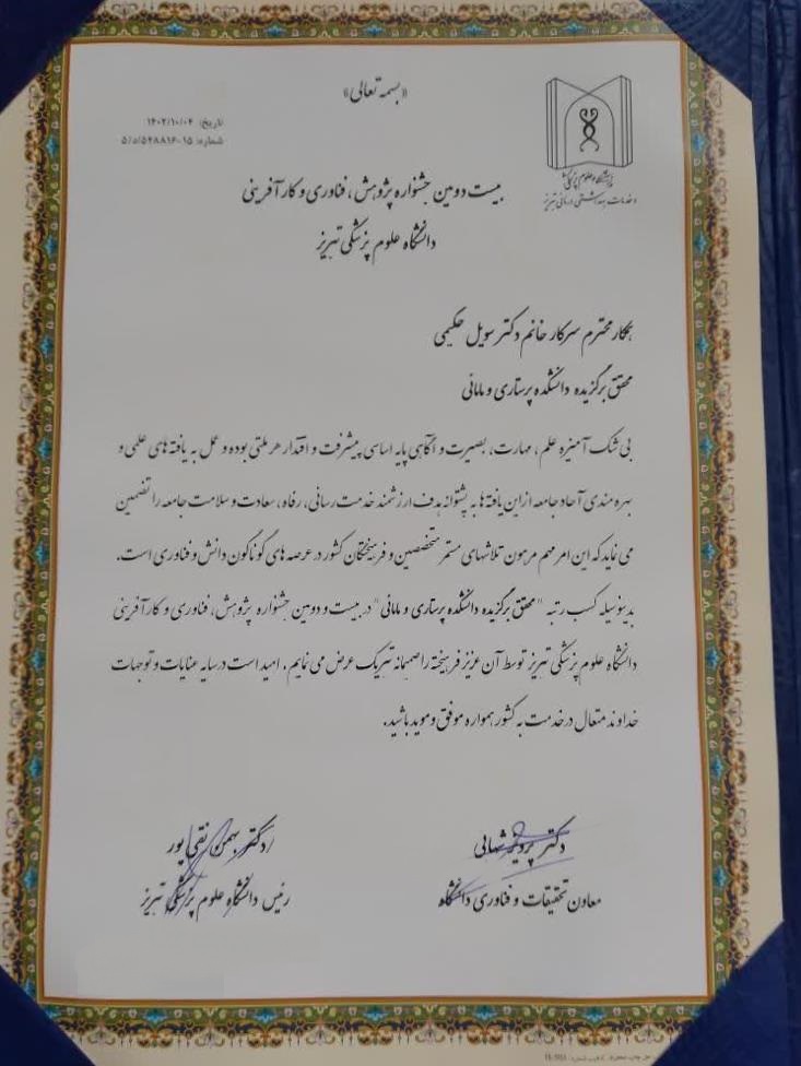 انتخاب خانم دکتر سویل حکیمی بعنوان محقق برگزیده دانشکده