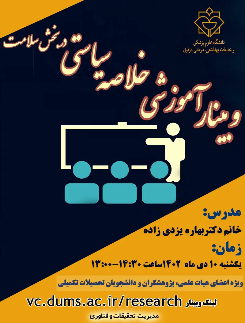به اطلاع علاقمندان میرساند وبینار آموزشی خلاصه سیاستی در بخش سلامت در دانشگاه علوم پزشکی دزفول، روز یکشنبه مورخ 10 دیماه 1402 برگزار خواهد گردید.