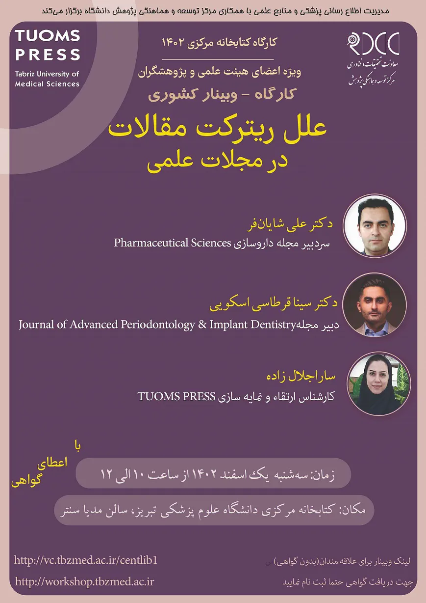 بدین وسیله به استحضار می رساند وبینار/کارگاه «علل ریترکت مقالات در مجلات علمی» از سری کارگاه های مدیریت اطلاع رسانی پزشکی و منابع علمی دانشگاه علوم پزشکی تبریز مورخه 1 اسفند 1402 از ساعت 10 الی 12 برگزار خواهد شد.