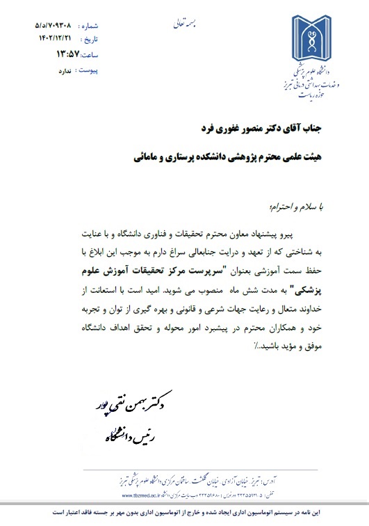 انتصاب آقای دکتر غفوری فرد بعنوان سرپرست مرکز تحقیقات آموزش علوم پزشکی دانشگاه