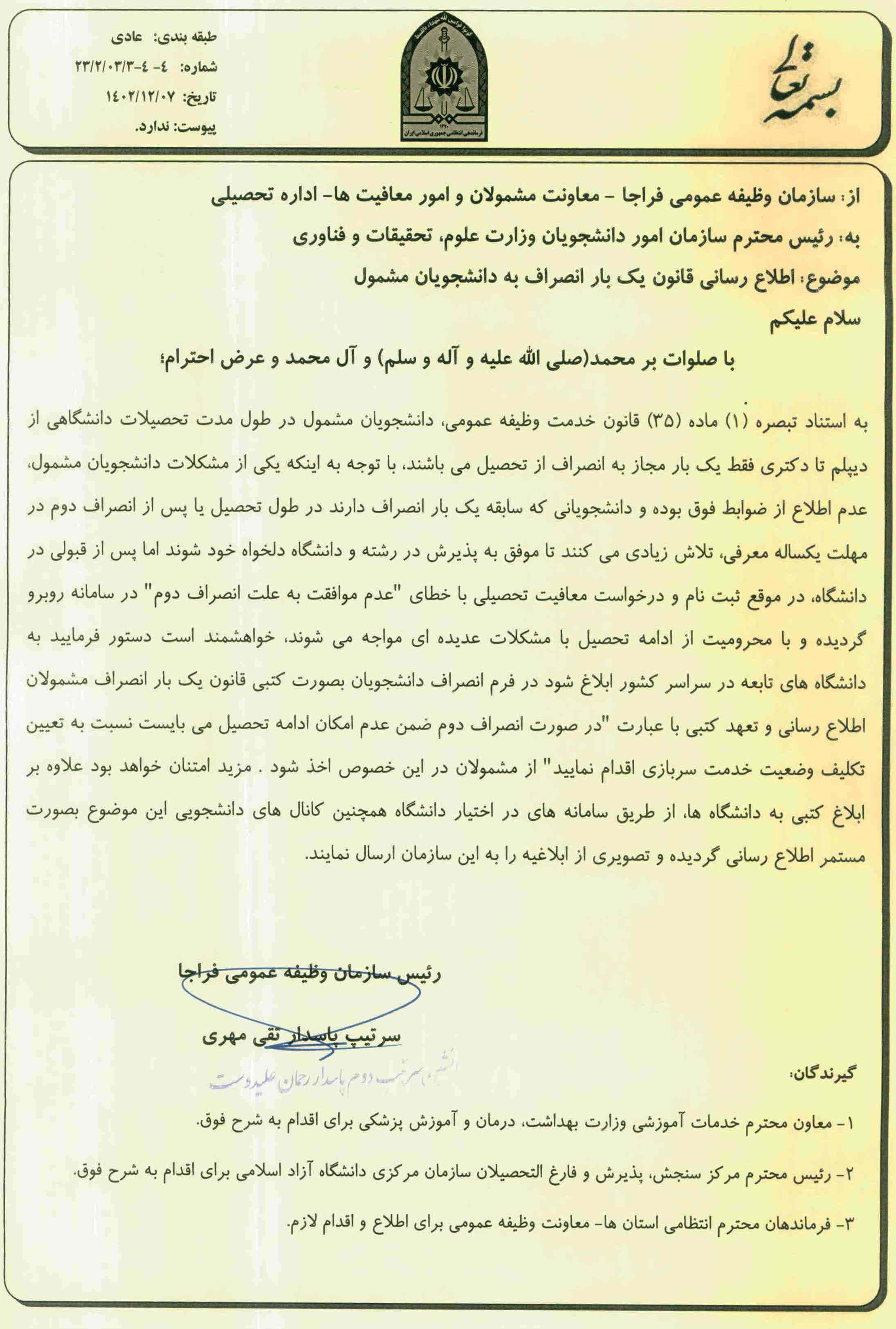 بخشنامه فراجا درخصوص قانون یکبار انصراف دانشجویان مشمول
