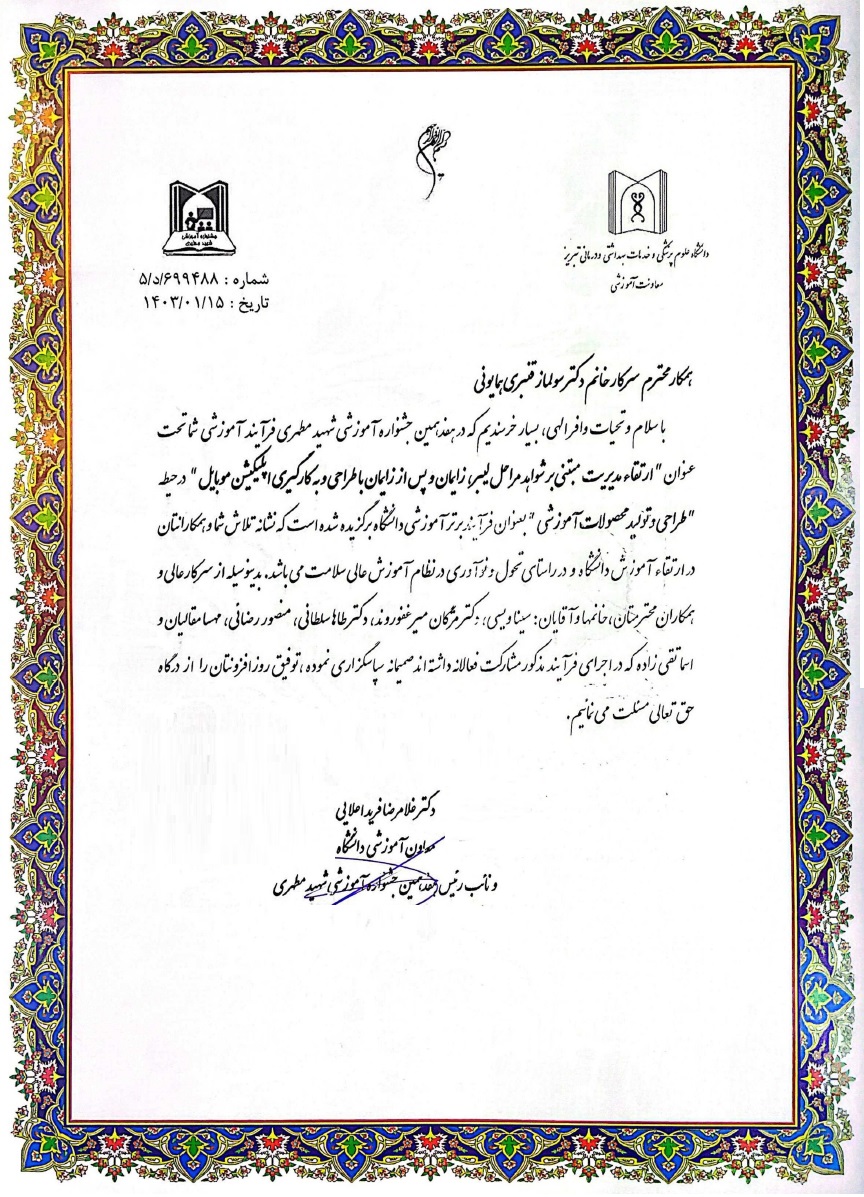 بدین وسیله موفقیت کسب عنوان فرآیند برتر آموزشی در جشنواره شهید مطهری، توسط سرکار خانم دکتر سولماز قنبری؛ عضو محترم هیات علمی گروه مامائی را خدمت ایشان تبریک و تهنیت عرض نموده، توفیق روزافزونشان را از درگاه خداوند منان خواستاریم.