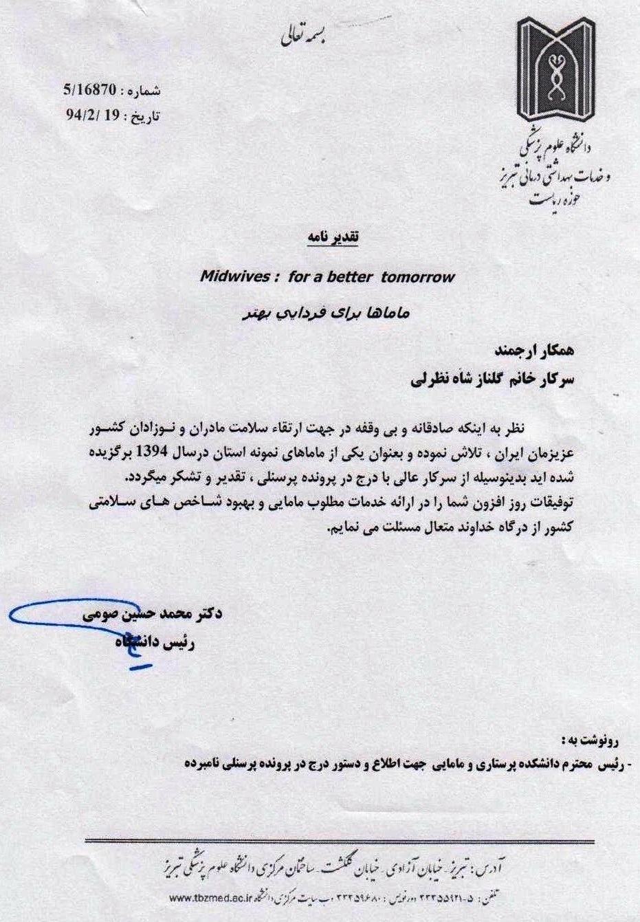 ریاست محترم دانشگاه علوم پزشکی تبریز طی نامه ای انتخاب سرکار خانم گلنساء شاه نظرلی بعنوان یکی از ماماهای نمونه استان در سال 94 را تبریک و از تلاش های صادقانه ایشان در جهت ارتقاء سلامت مادران و نوزادان قدردانی نمودند.