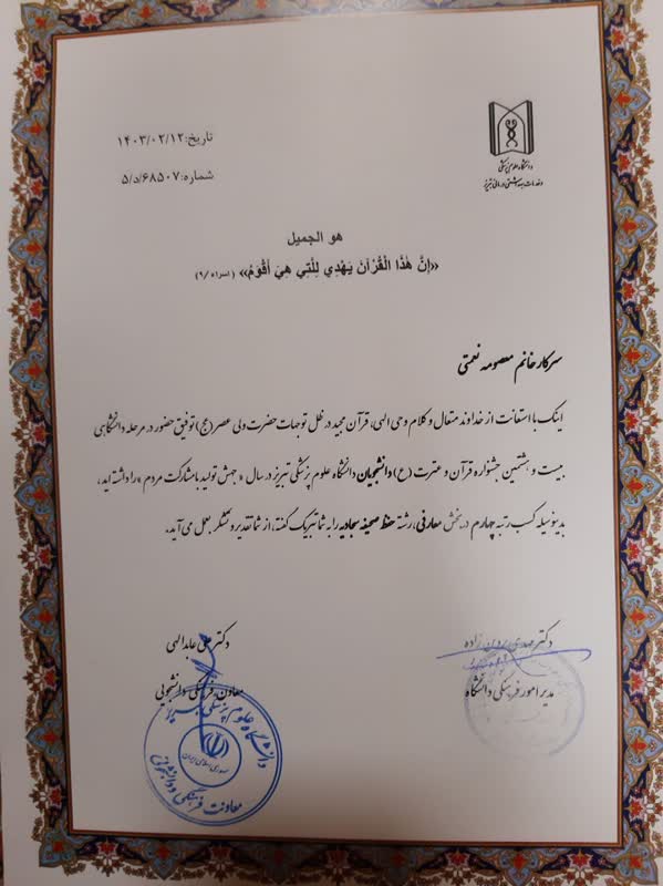 بدینوسیله موفقیت جمعی از دانشحویان دانشکده بنام های سرکار خانم ها معصومه نعمتی، اسماء نقی زاده و روزیتا چراغی و آقای امین باستانی اسکوئی در مرحله دانشگاهی بیست و هشتمین جشنواره قرآن و عترت دانشجویان دانشگاه را خدمت ایشان تبریک عرض نموده، موفقیت روزافزونشان را از درگاه خداوند متعال خواستاریم.