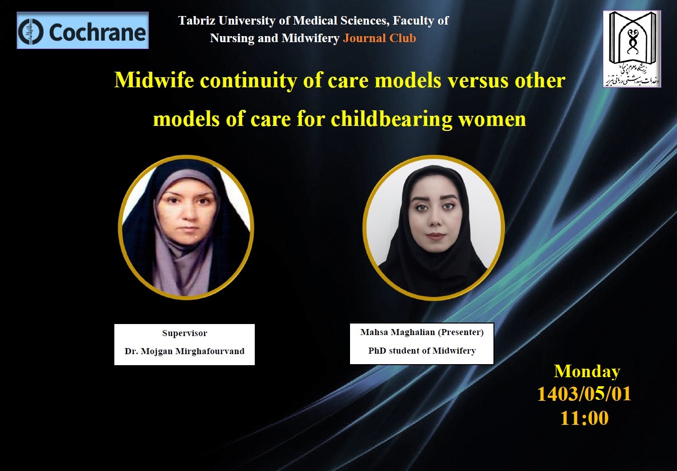 1- ارائه برنامه سالانه ژورنال کلاب توسط سرکار خانم مهسا مقالیان دانشجوی PhD گروه مامایی، با عنوان Midwifery continuity of care models versus other models of care for childbearing women