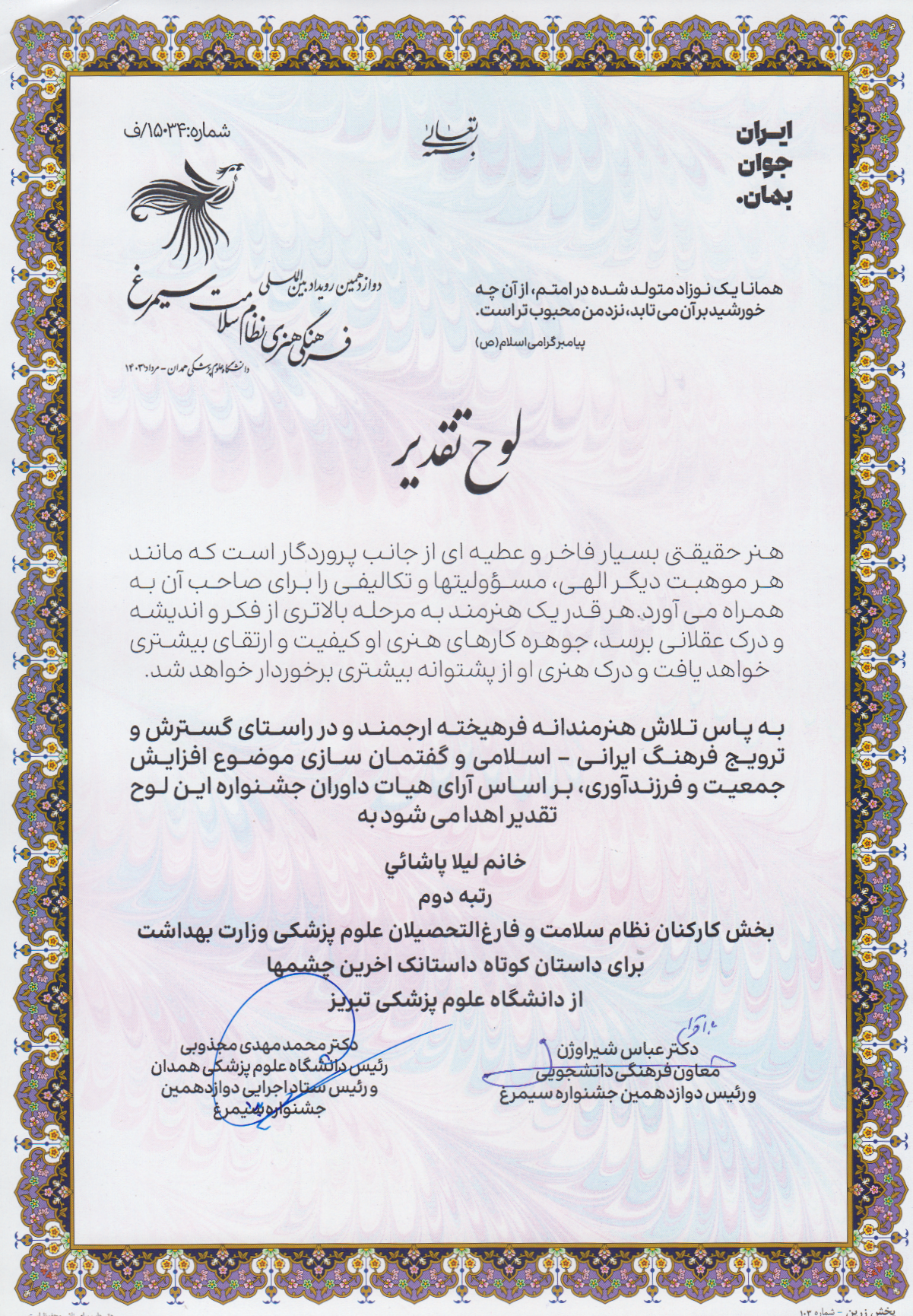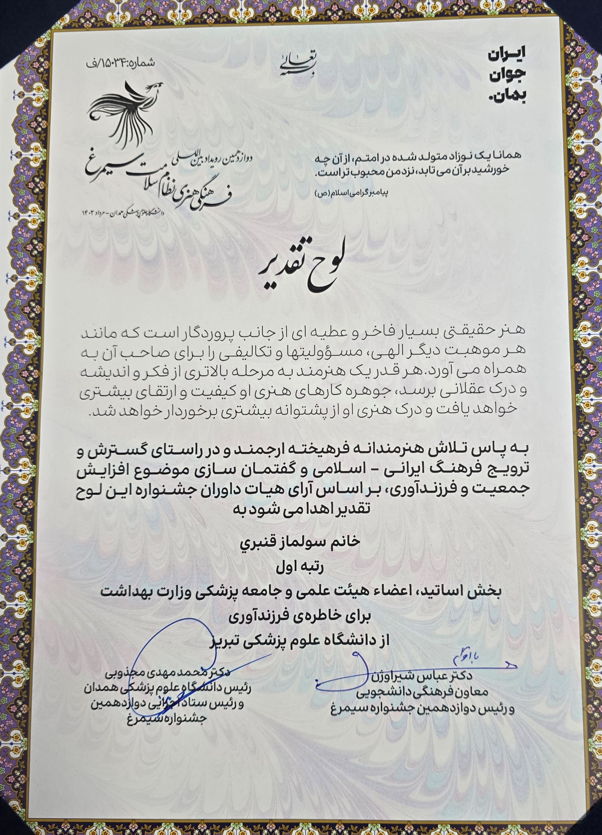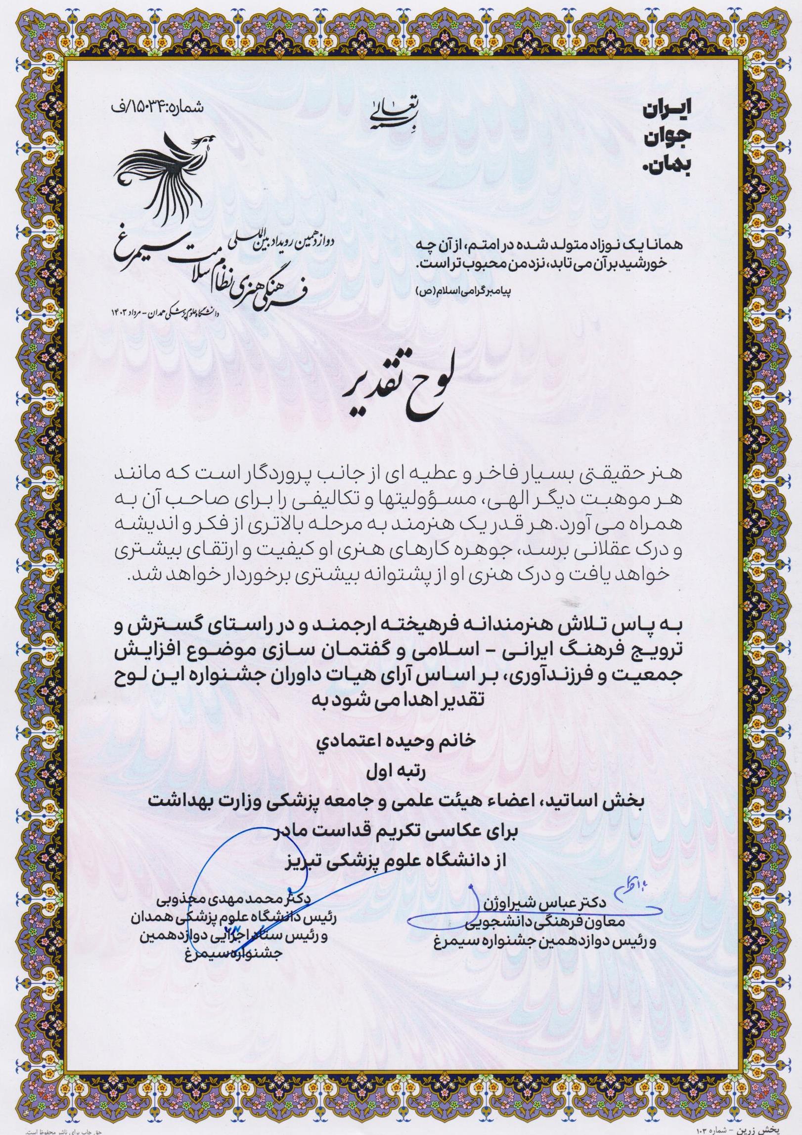 به گزارش روابط عمومی دانشگاه علوم پزشکی تبریز، اختتامیه دوازدهمین جشنواره بین المللی سیمرغ روز پنج شنبه، چهارم مرداد ماه ۱۴۰۳، با شعار «ایران جوان بمان» و با هدف گفتمان سازی موضوع جوانی جمعیت و فرزند آوری در سالن های همایش دانشگاه علوم پزشکی همدان برگزار شد. در این جشنواره همکاران دانشکده، سرکار خانم دکتر سولماز قنبری در بخش اساتید موفق به کسب رتبه اول برای خاطره فرزندآوری و در بخش کارکنان سرکار خانم ها لیلا پاشایی موفق به کسب رتبه دوم برای بخش داستان کوتاه داستانک «آخرین چشمها» و وحیده اعتمادی نیز موفق به کسب رتبه اول بخش عکاسی تکریم قداست مادر گردید.