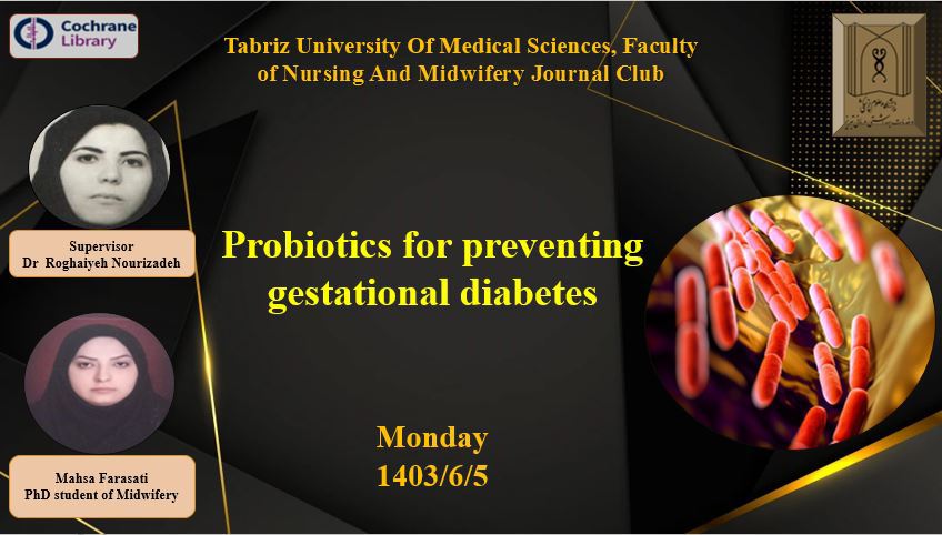 دستور جلسه: ارائه برنامه سالانه ژورنال کلاب توسط سرکار خانم مهسا فراستی دانشجوی PhD گروه مامایی، (با عنوان Prebiotics for preventing gestational diabetes)
