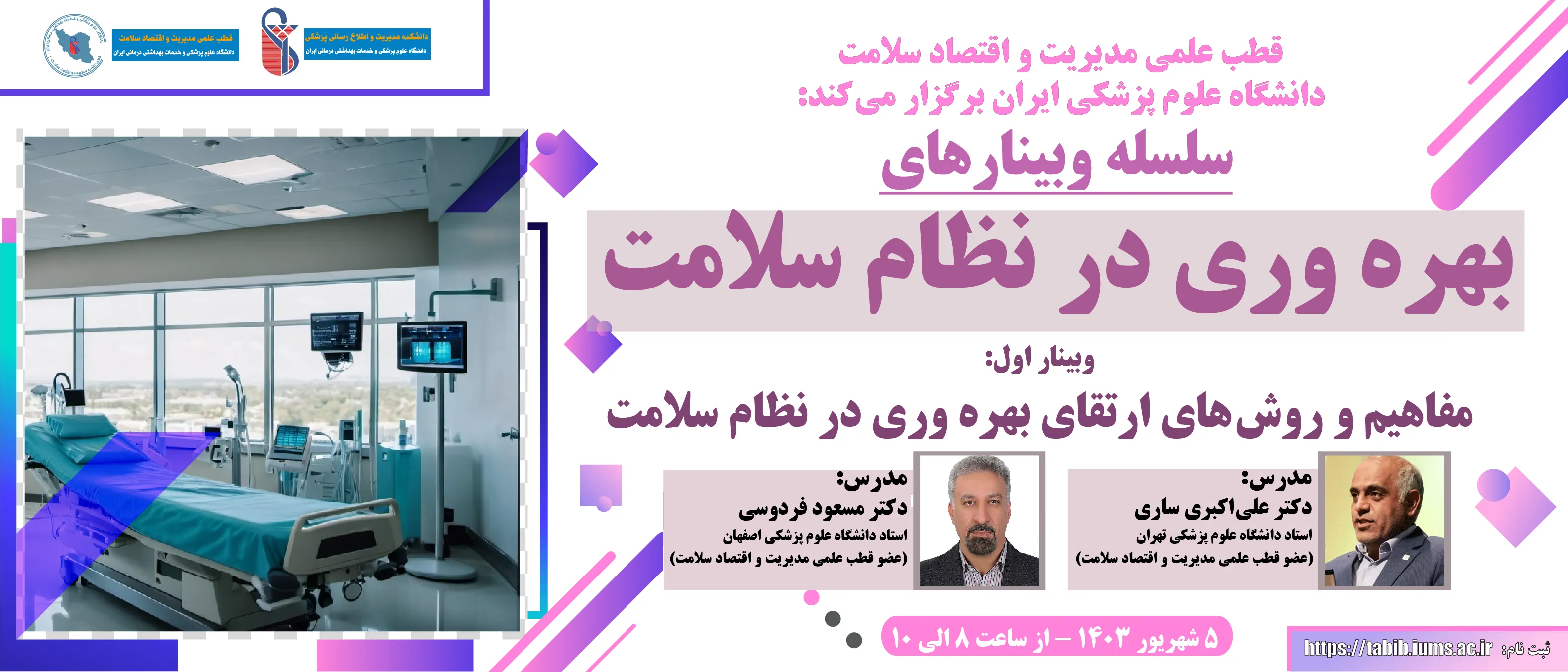 به اطلاع علاقمندان میرساند وبینار اول از سلسله وبینارهای "بهره وری در نظام سلامت" در قطب علمی مدیریت و اقتصاد سلامت دانشگاه علوم پزشکی ایران، 5 شهریور 1403 از ساعت 8 الی 10 برگزار خواهد گردید.