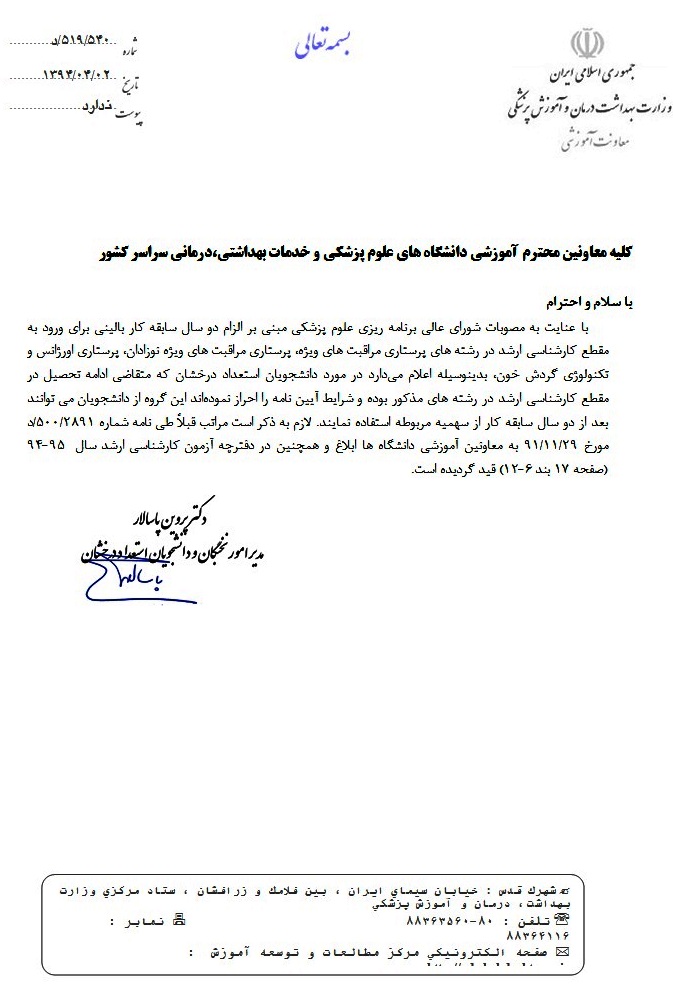 مدیر امور نخبگان و دانشجویان استعداد درخشان وزارت بهداشت درخصوص دانشجویان استعداد درخشان متقاضی ادامه تحصیل در مقطع کارشناسی ارشد برخی رشته های پرستاری ...