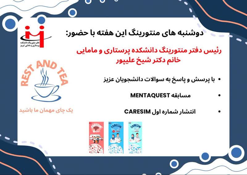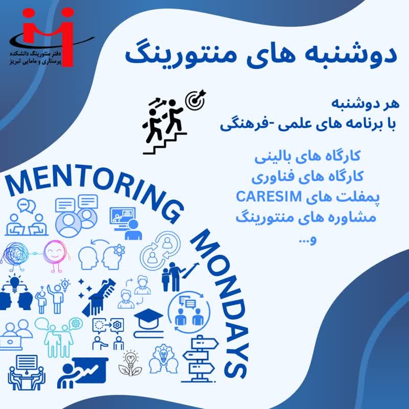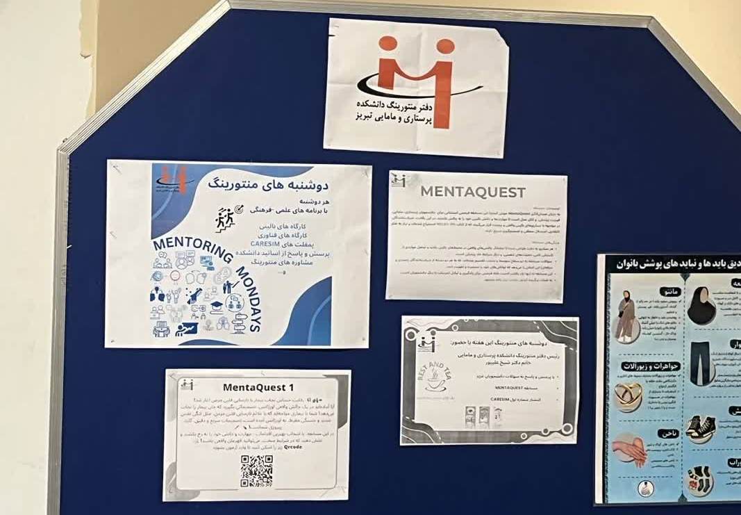 برنامه «دوشنبه های منتورینگ» برای اولین بار در تاریخ ۷ آبان ۱۴۰۳ در ساعت یک در دانشکده پرستاری و مامایی تبریز برگزار شد. این برنامه که با محوریت سه برنامه از قبیل : پرسش و پاسخ مستقیم با دانشجویان مسابقه جذاب و چالشبرانگیز MENTAQUEST رونمایی از شماره اول CARESIM برگزار گردید ...