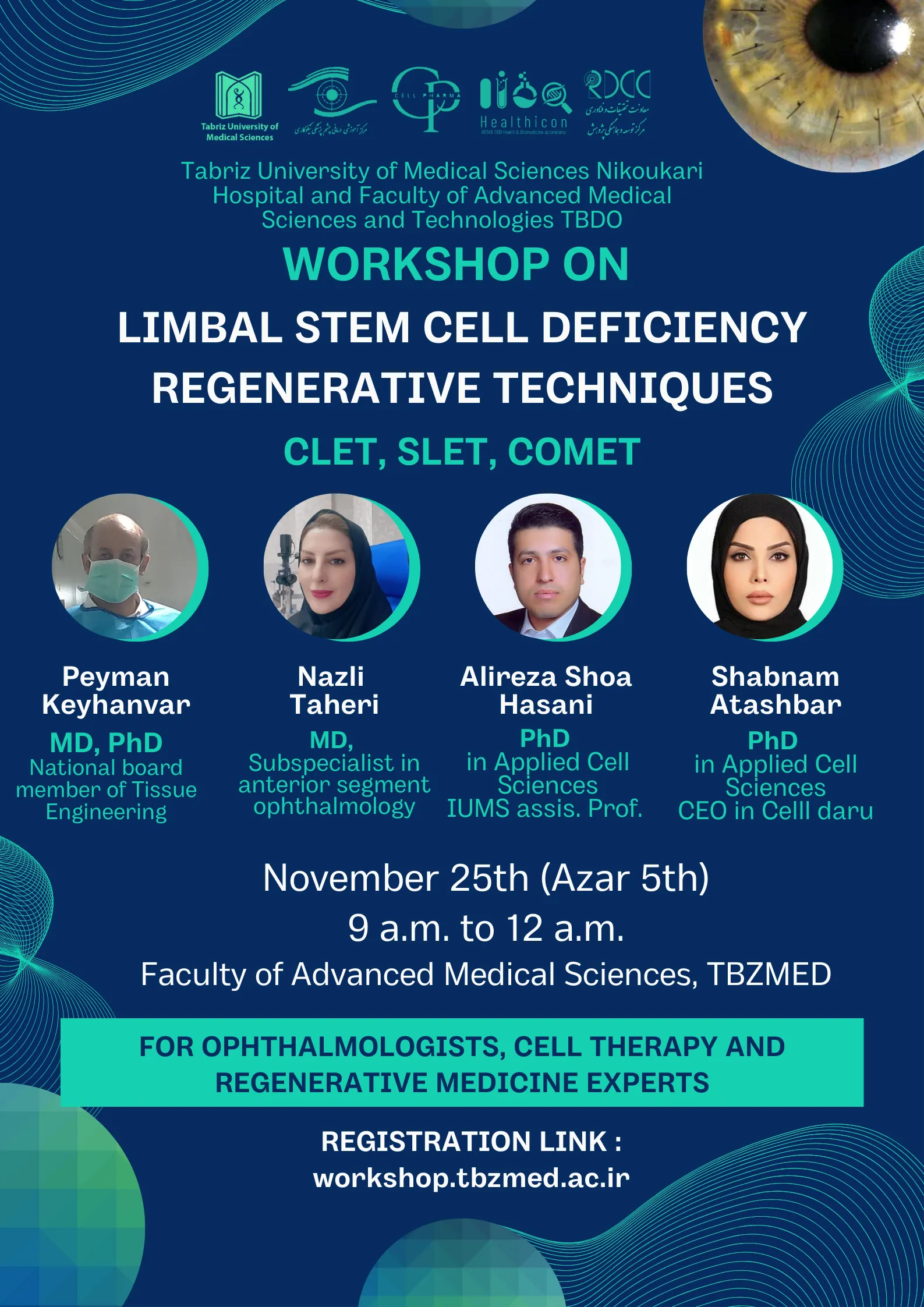 | 2 | کارگاه تکنیکهای پزشکی بازساختی، سلول درمانی و مهندسی بافت CLET, SLET, COMET در Limbal Stem Cell Deficiency (LSCD) | دوشنبه ۵ آذر ماه |