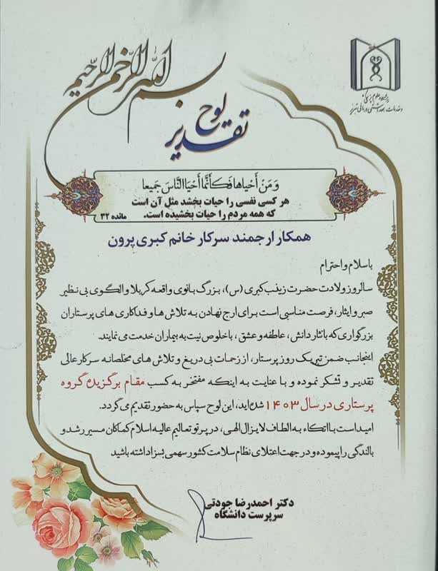 کسب مقام برگزیده گروه پرستاری توسط سرکار خانم پرون