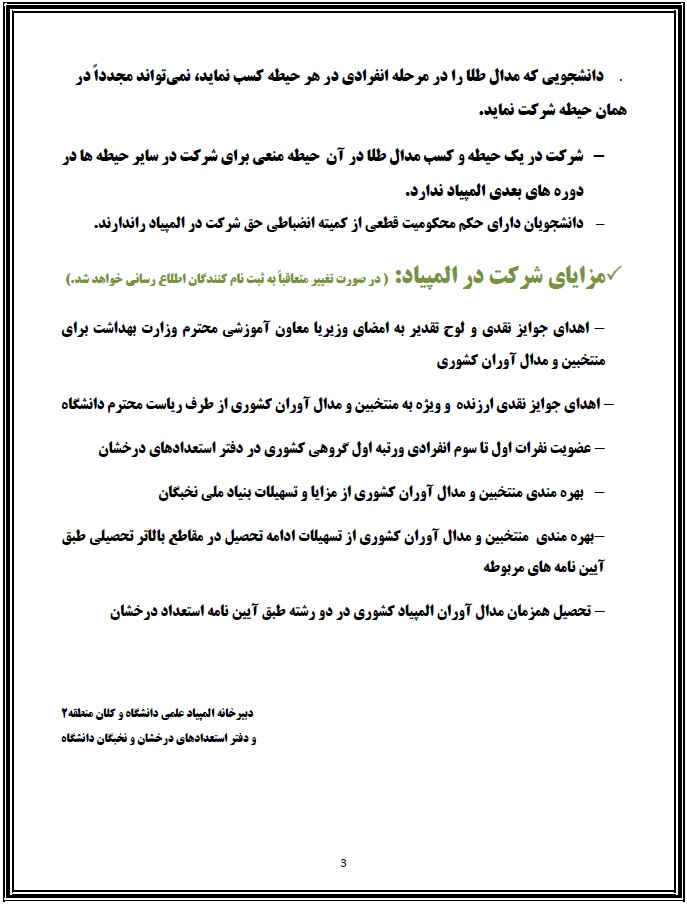 - تحصیل همزمان مدال آوران المپیاد کشوری در دو رشته طبق آیین نامه استعداد درخشان