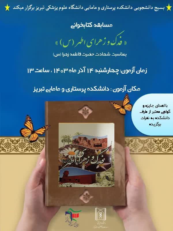 به اطلاع علاقمندان میرساند مسابقه کتابخوانی «فدک و زهرای اطهر (س)» (با ارائه گواهی معتبر از طرف دانشکده به نفرات برگزیده) به همت بسیج دانشجویی دانشکده، همراه با برپایی مراسم سوگواری بمناسبت شهادت خانم حضرت فاطمه زهرا (س)، روز چهارشنبه مورخ 14 آذرماه 1403 راس ساعت 13 برگزار خواهد گردید.