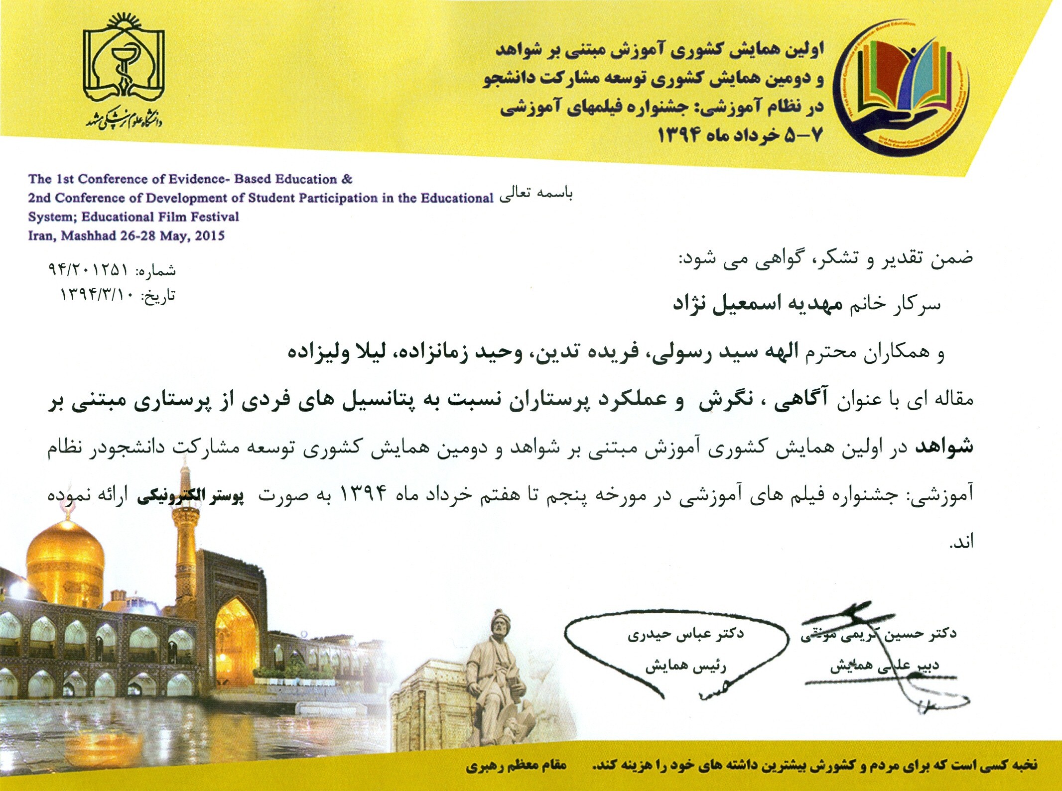 افتخار آفرینی سرکار خانم مهدیه اسمعیل نژاد در اولین همایش کشوری آموزش مبتنی بر شواهد