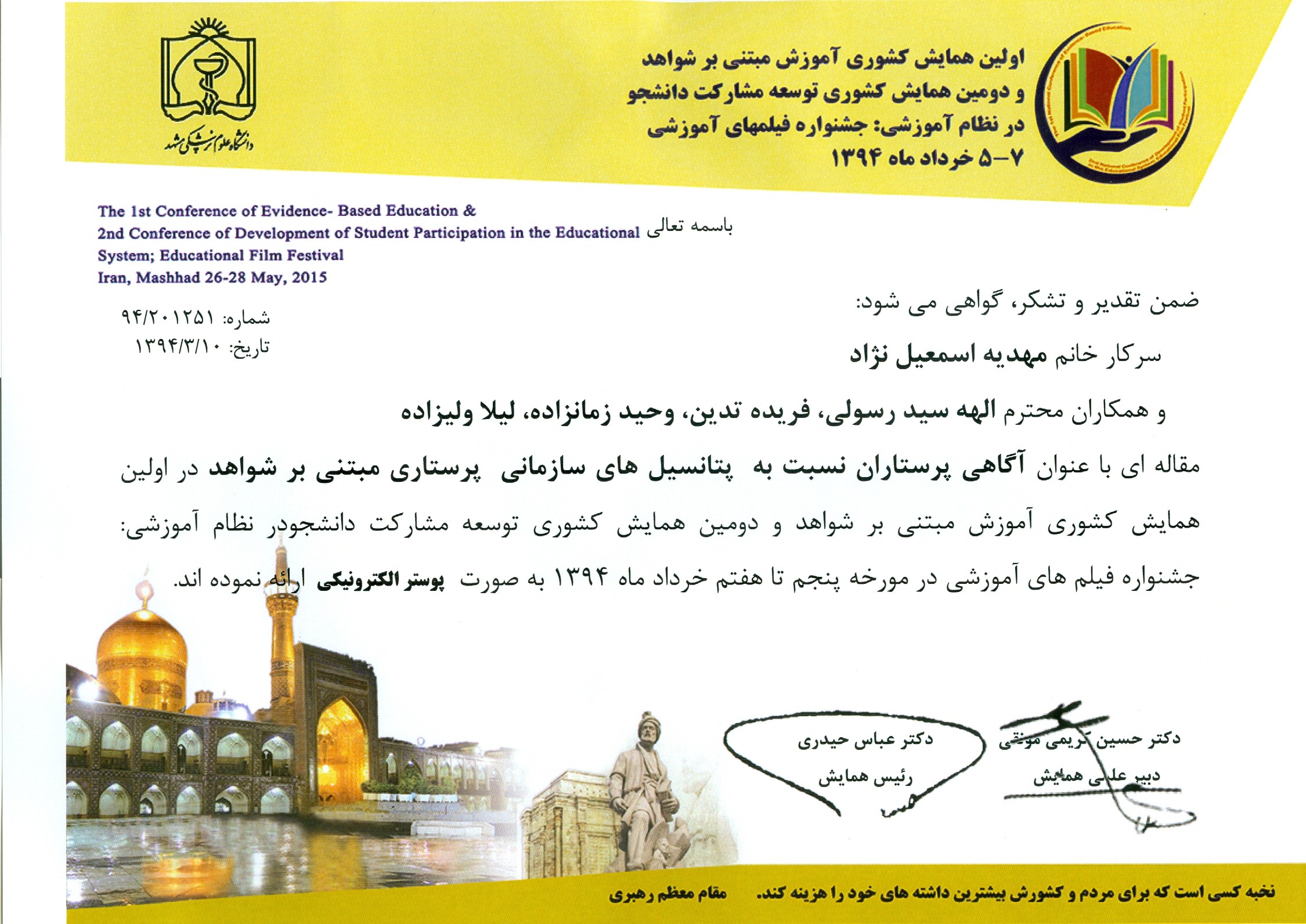 بدینوسیله افتخار آفرینی سرکار خانم مهدیه اسمعیل نژاد، دانشجوی رشته پرستاری دانشکده در اولین همایش کشوری آموزش مبتنی بر شواهد و دومین همایش کشوری توسعه مشارکت دانشجو در نظام آموزشی را تبریک عرض می نمائیم.