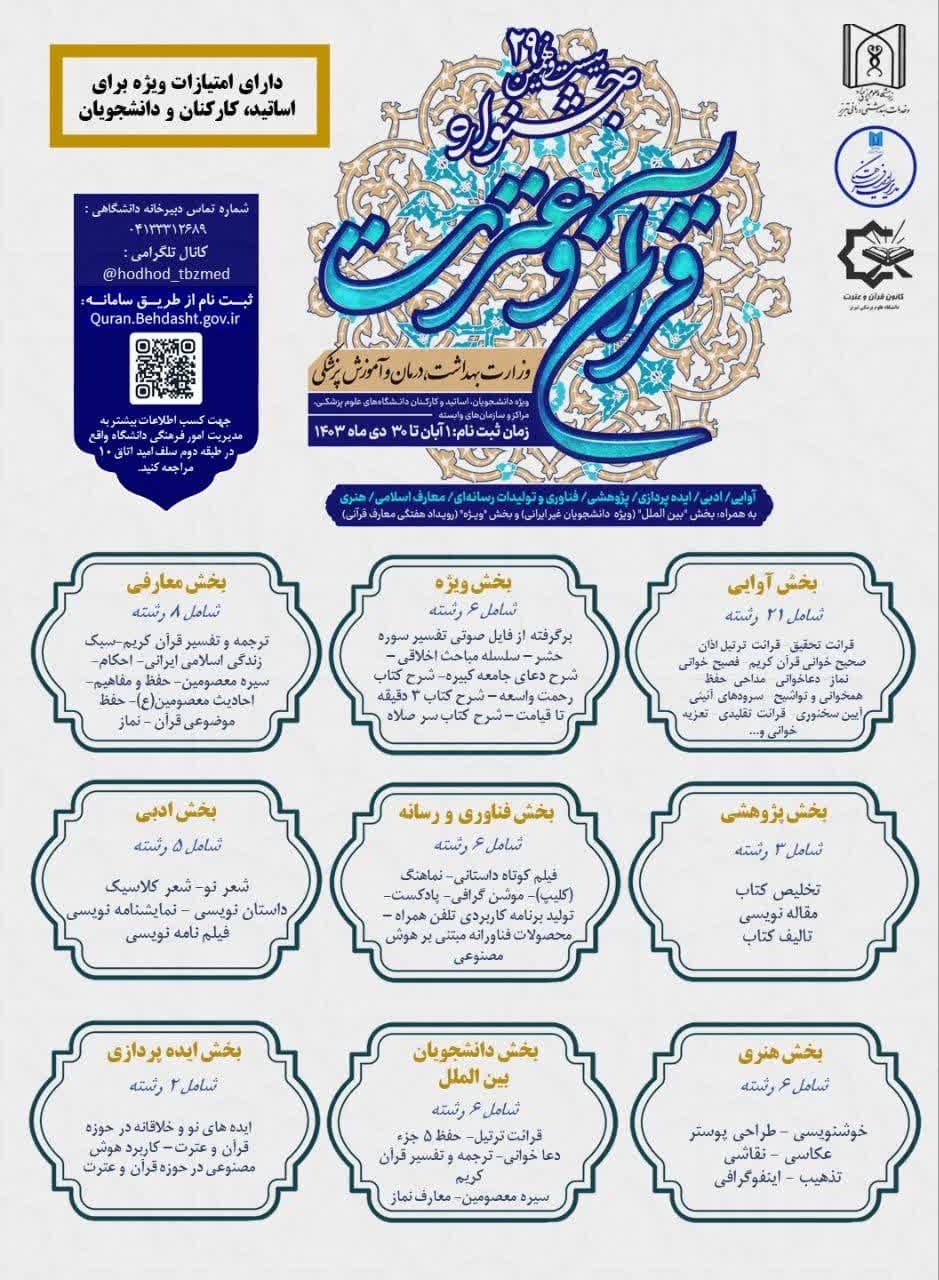 پیرو نامه شماره 396069/د/5 در خصوص جشنواره سراسری قرآن و عترت دانشگاه های علوم پزشکی کشور به استحضار می رساند؛ بیست و نهمین جشنواره قرآن و عترت ویژه دانشجویان، اساتید، کارکنان در بخشهای مختلف برگزار می گردد. ترتیبی اتخاذ فرمائید با شرکت حداکثری در جشنواره در جهت رشد و اعتلای فرهنگی قرآنی جامعه سهیم باشیم. در ضمن با توجه به تعداد ثبت نامی های در پایان، مراکز تابعه دانشگاه رتبه بندی و از مراکز برتر تقدیر بعمل خواهد آمد. پوستر جشنواره همراه با آئین نامه اجرایی بخش های مختلف جشنواره جهت بهره برداری لازم به پیوست ارسال می گردد. آخرین مهلت ثبت نام جشنواره: 1403/10/30
