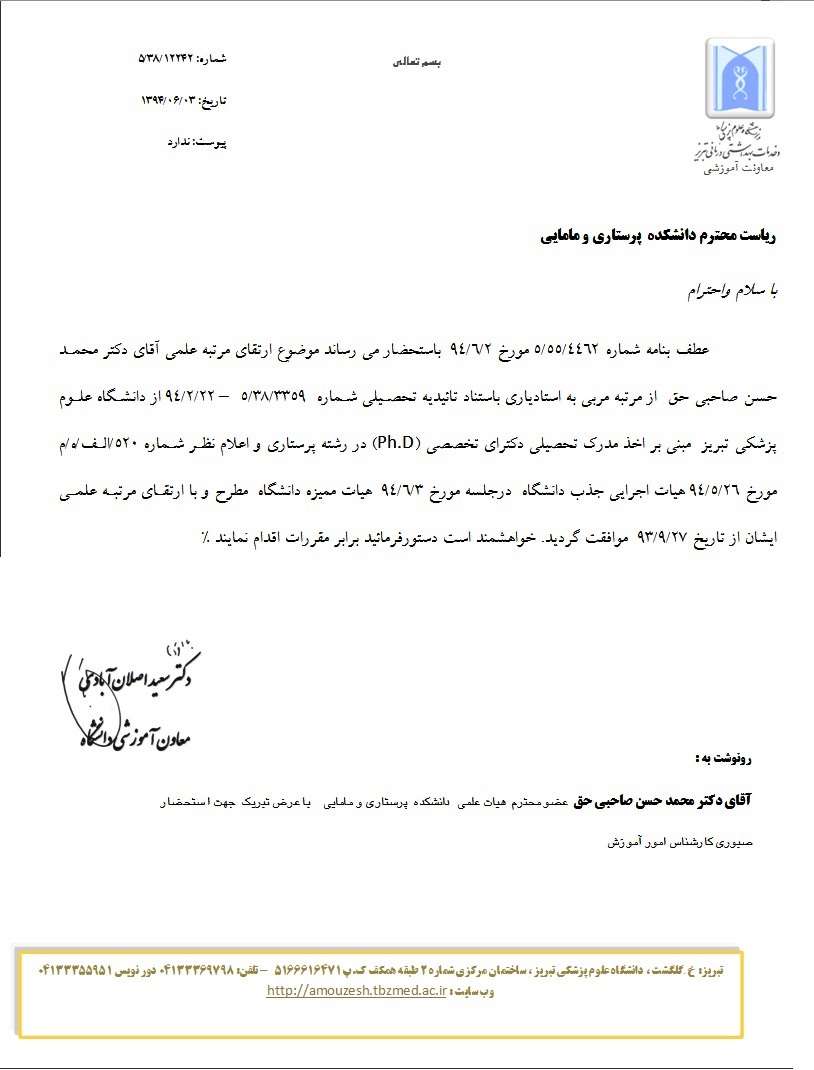 بدینوسیله ارتقاء مرتبه علمی جناب آقای دکتر محمد حسن صاحبی حق، عضو محترم هیأت علمی گروه پرستاری بهداشت به مرتبه استادیاری ...