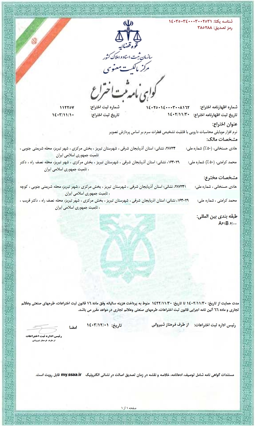بدین وسیله ثبت اختراع تحت عنوان «نرم افزار موبایلی محاسبات دارویی با قابلیت تشخصی قطرات سرم بر اساس پردازش تصویر» توسط همکار ارجمندمان جناب آقای دکتر هادی حسنخانی (استاد محترم گروه پرستاری داخلی جراحی) و دانشجوی فارغ التحصیل دانشکده ...