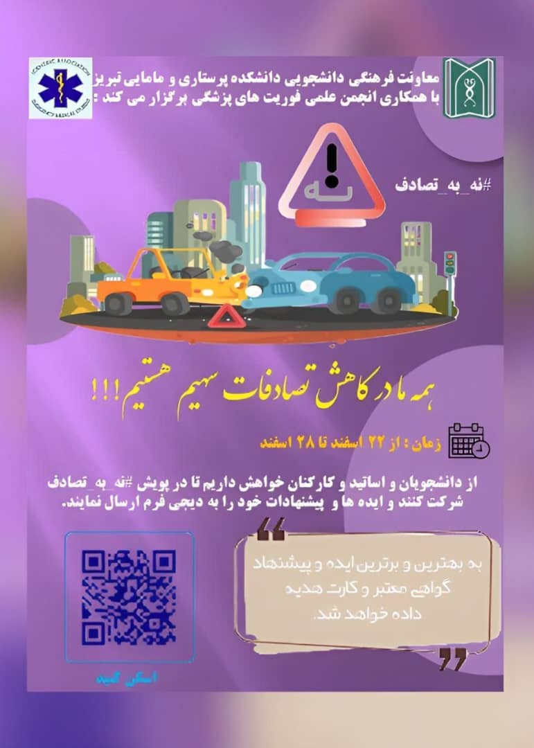 به اطلاع علاقمندان میرساند معاونت فرهنگی دانشجویی دانشکده پرستاری و مامایی با همکاری انجمن علمی فوریت های پزشکی پویش 🚨#نه_به_تصادف را برگزار می کند.