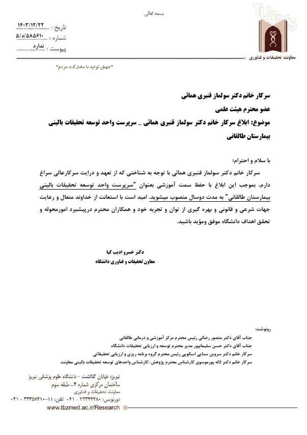 انتصاب خانم دکتر قنبری بعنوان سرپرست واحد توسعه تحقیقات بالینی بیمارستان طالقانی