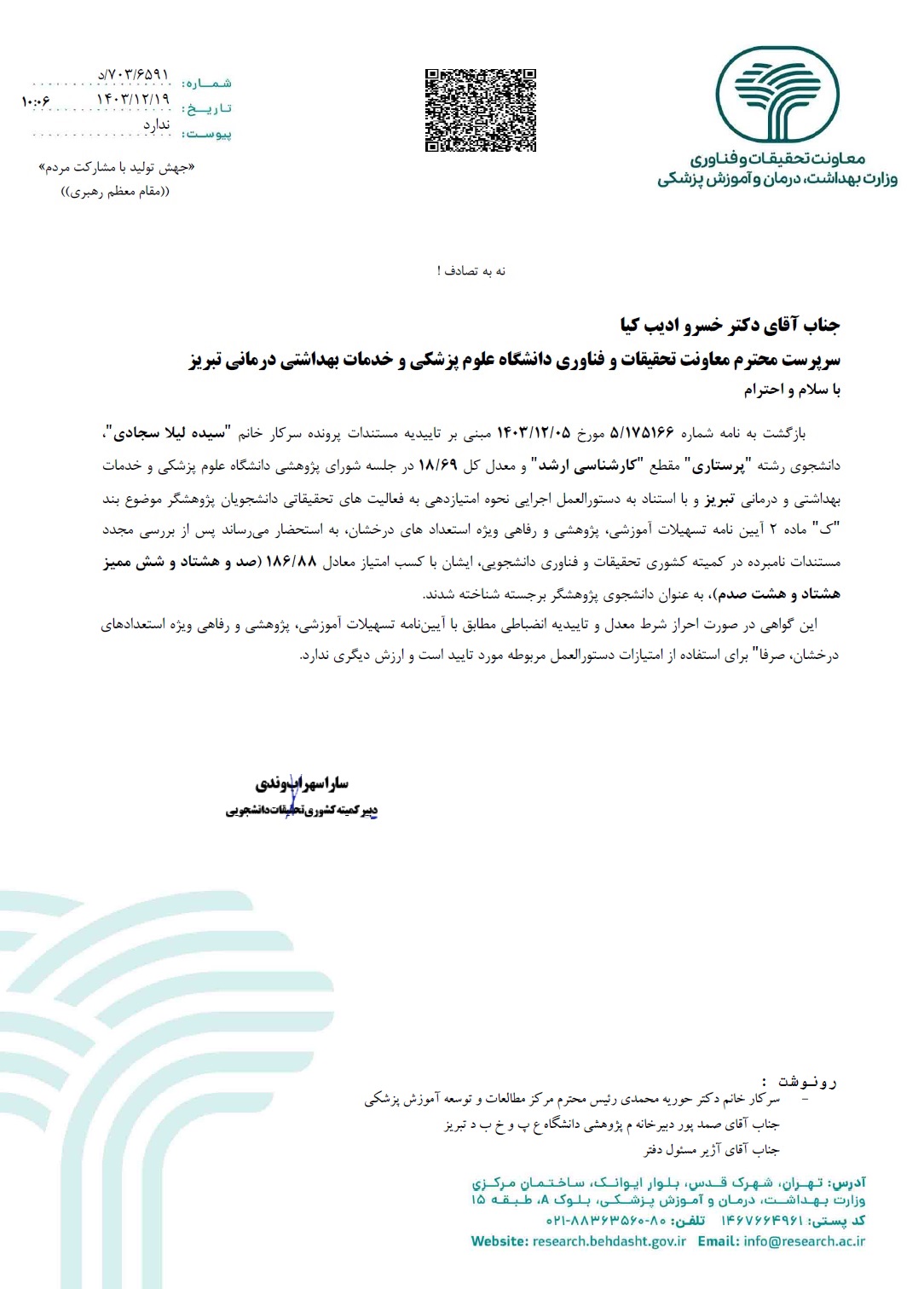 انتخاب خانم لیلا سجادی دانشجوی کارشناسی ارشد پرستاری داخلی جراحی بعنوان پژوهشگر برجسته کشوری