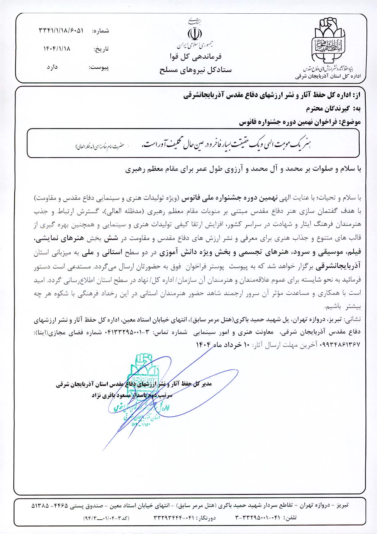 به اطلاع علاقمندان میرساند سازمان هنری و امور سینمایی دفاع مقدس نهمین جشنواره ملی تولیدات هنری فانوس را برگزار مینماید. مهلت ارسال آثار به این جشنواره، تا 10 خرداد 1404 میباشد.
