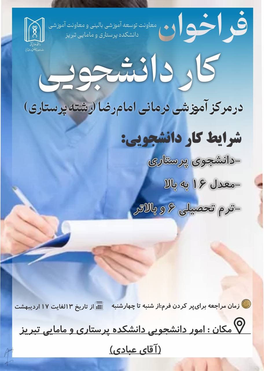 به اطلاع متقاضیان کار دانشجویی در رشته پرستاری میرساند برای شرکت در این فراخوان میتوانند از 13 الی 17 اردیبهشت 1404 به امور دانشجویی دانشکده مراجعه نمایند.