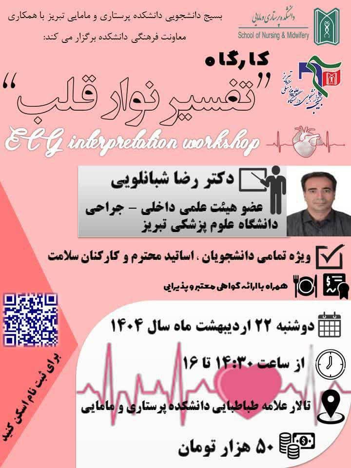 بسیج دانشجویی دانشکده پرستاری و مامایی تبریز با همکاری معاونت فرهنگی دانشجویی دانشکده برگزار می کند: کارگاه "🫀 تفسیر نوار قلب 🫀"