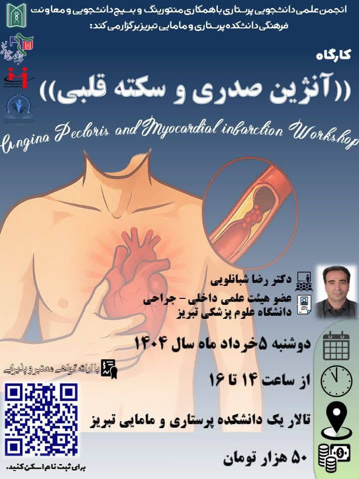 به اطلاع علاقمندان میرساند انجمن علمی دانشجویی پرستاری تبریز با همکاری دفتر منتورینگ، بسیج دانشجویی و معاونت فرهنگی دانشکده پرستاری و مامایی تبریز کارگاه آموزشی «آنژین صدری و سکته قلبی» را برگزار می کند.