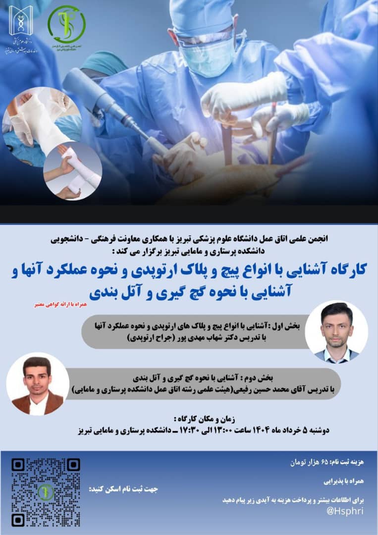 🔴انجمن علمی اتاق عمل با همکاری معاونت فرهنگی ـ دانشجویی دانشکده پرستاری و مامایی تبریز برگزار میکند: کارگاهِ آشنایی با انواع پیچ و پلاک ارتوپدی و نحوه عملکرد آنها و آشنایی با نحوه گچ گیری و آتل بندی