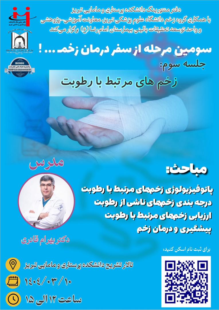 دفتر منتورینگ دانشکده پرستاری و مامایی تبریز با همکاری گروه زخم دانشگاه علوم پزشکی تبریز، معاونت آموزشی-پژوهشی و واحد توسعه تحقیقات بالینی بیمارستان امام رضا (ع) برگزار میکند:
