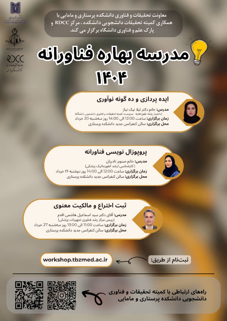 به اطلاع علاقمندان میرساند معاونت تحقیقات و فناوری دانشکده پرستاری و مامائی تبریز با همکاری کمیته تحقیقات دانشجویی دانشکده و مرکز RDCC و پارک علم و فناوری دانشگاه، مدرسه بهاره فناورانه 1404 را برگزار مینماید.
