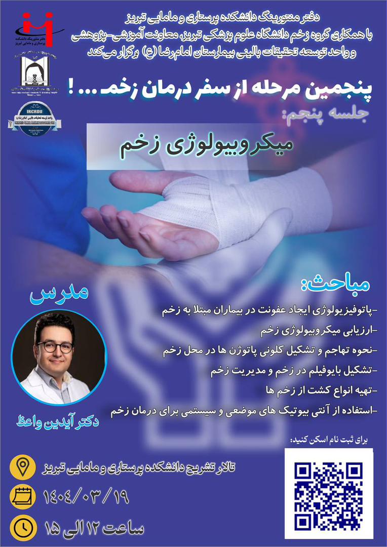 دفتر منتورینگ دانشکده پرستاری و مامایی تبریز با همکاری گروه زخم دانشگاه علوم پزشکی تبریز، معاونت آموزشی-پژوهشی و واحد توسعه تحقیقات بالینی بیمارستان امام رضا (ع) برگزار میکند: