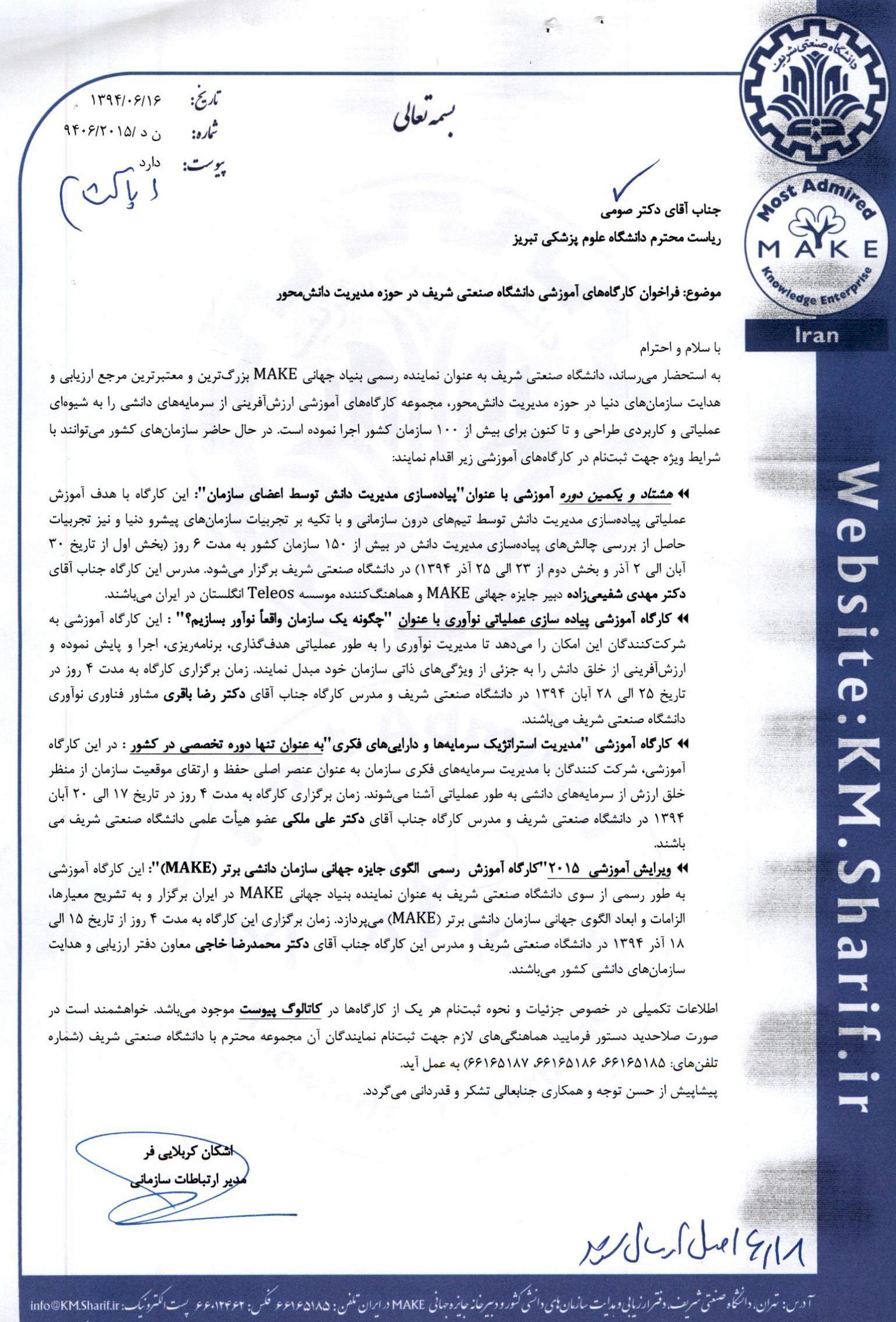 به استحضار می رساند دانشگاه صنعتی شریف بعنوان نماینده رسمی بنیاد جهانی MAKE، بزرگترین و معتبرترین مرجع ارزیابی و هدایت سازمان های دنیا در حوزه مدیریت دانش محور ...