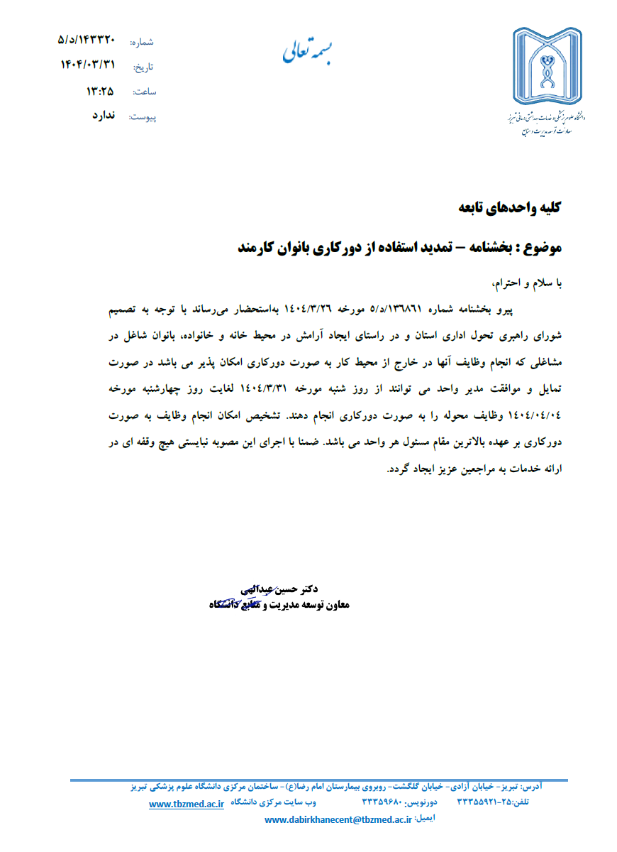 بخشنامه معاونت توسعه مدیریت و منابع دانشگاه درخصوص تمدید استفاده از دورکاری بانوان کارمند به شرح زیر میباشد.