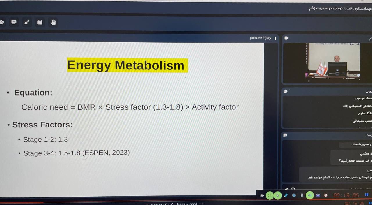 آخرین جلسه از سلسله کارگاههای تخصصی مدیریت و آموزش زخم با محوریت «تغذیه و تغذیه درمانی» در تاریخ ۲۲ تیر ۱۴۰۴ برگزار شد. این جلسه به همت دفتر منتورینگ دانشکده پرستاری و مامایی تبریز و با همکاری گروه زخم دانشگاه علوم پزشکی تبریز، معاونت آموزشی-پژوهشی و واحد توسعه تحقیقات بالینی بیمارستان امام رضا (ع) برگزار گردید. در این جلسه، دکتر محمد علیزاده به عنوان مدرس، به بررسی جنبههای تغدیه و تغذیه درمانی بیماران مبتلا به زخم پرداخت. این جلسه به صورت وبینار در بستر مجازی اسکای روم برگزار گردید.