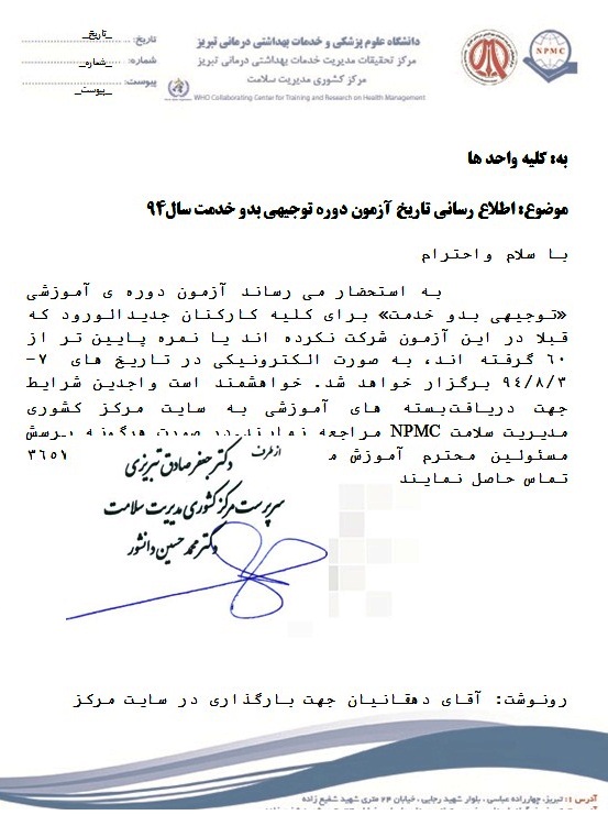 اطلاعیه سرپرست مرکز کشوری مدیریت سلامت درخصوص آزمون دوره آموزشی "توجیهی بدو خدمت"