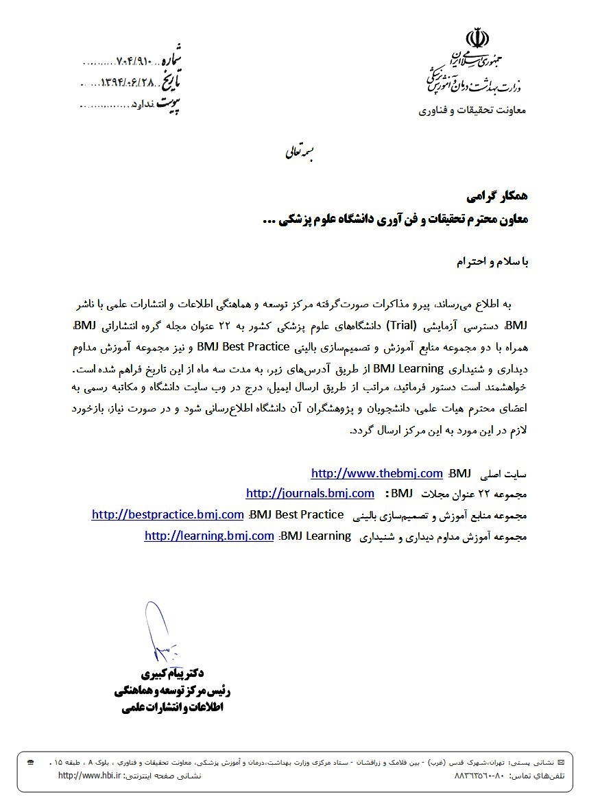 بنابر اعلام دکتر کبیری، رئیس مرکز توسعه و هماهنگی اطلاعات و انتشارات علمی وزارت بهداشت، دسترسی آزمایشی (Trial) به منابع گروه انتشاراتی BMJ ...