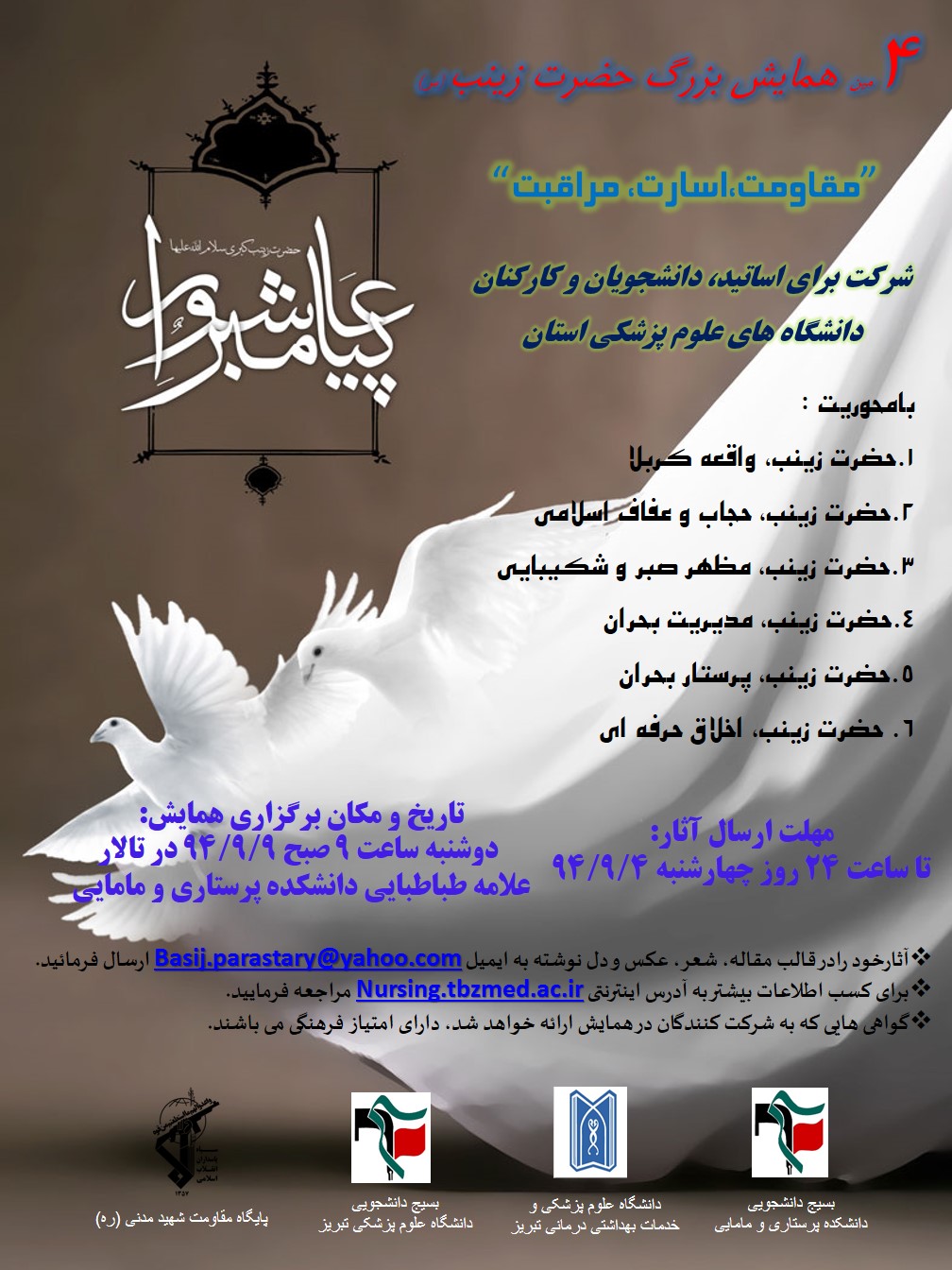 چهارمین همایش بزرگ حضرت زینب (س) با عنوان "مقاومت، اسارت، مراقبت" نهم آذرماه در دانشکده پرستاری و مامایی تبریز برگزار خواهد گردید.