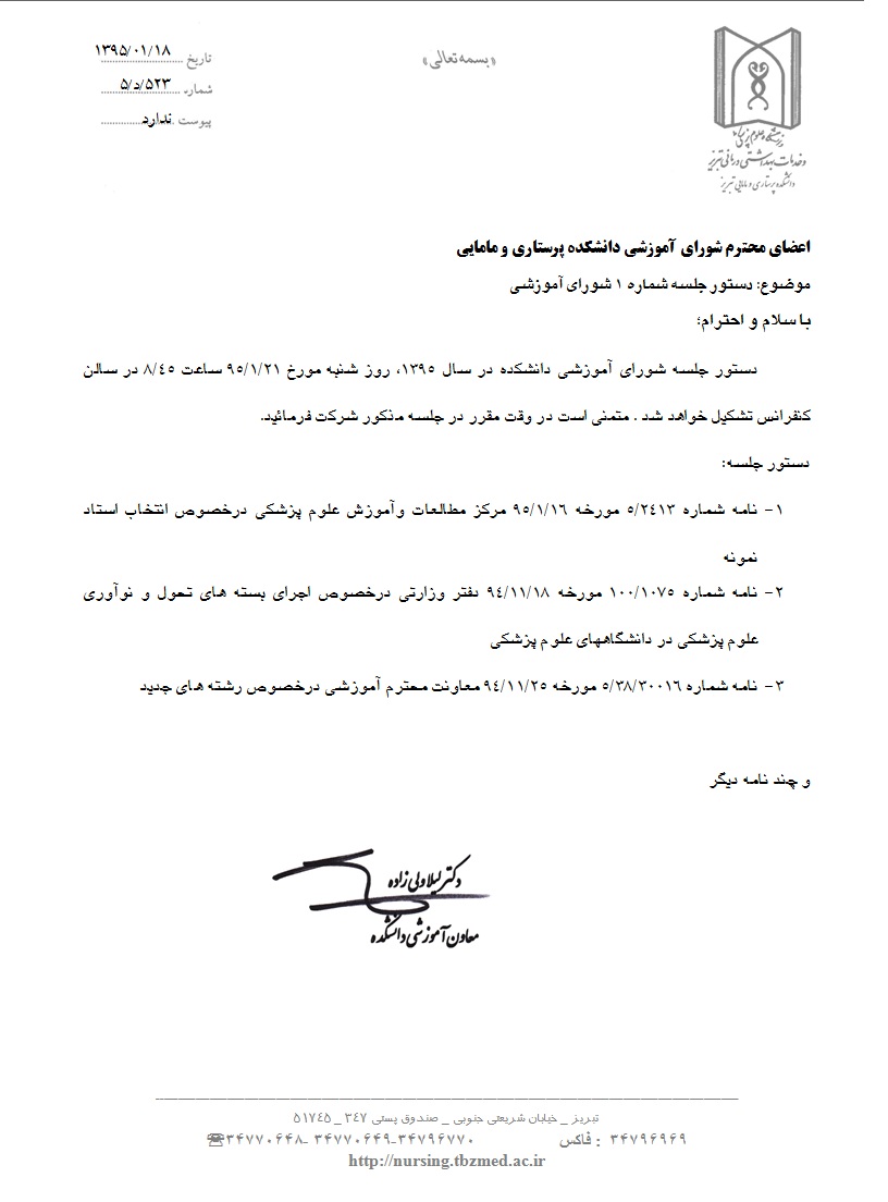 دستور اولین جلسه شورای آموزشی دانشکده در سال 95؛ روز شنبه مورخه 21 فروردین